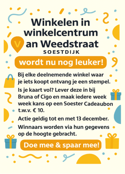 Heb je je stempelkaart vol? Lever deze dan in bij Bruna of Cigo en maak iedere week kans op een Soester Cadeaubon t.w.v. €10,-!