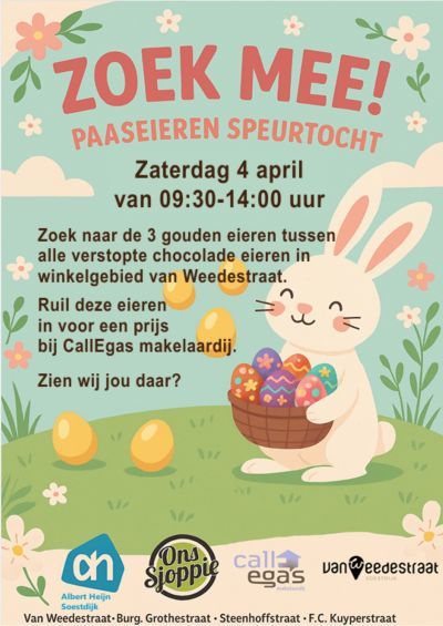 Kom zaterdag 4 april zoeken naar paaseieren in winkelcentrum Soest - Van Weedestraat. De chocolade eieren zijn buiten in de hele winkelstraat (Van Weedestraat, Steenhoffstraat, Burg. Grothestraat en F.C. Kuyperstraat) verstopt. Tussen al deze eieren zitten ook drie gouden eieren verstopt, die kun je inwisselen voor een prijs bij CallEgas Makelaardij. De zoektocht begint om 09.30 uur en eindigt rond 14.00 uur. Kom jij gezellig meezoeken?